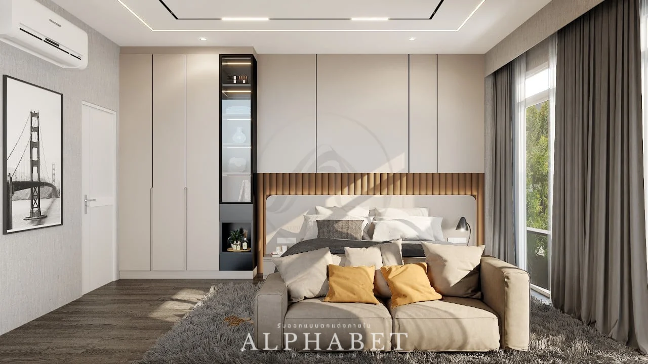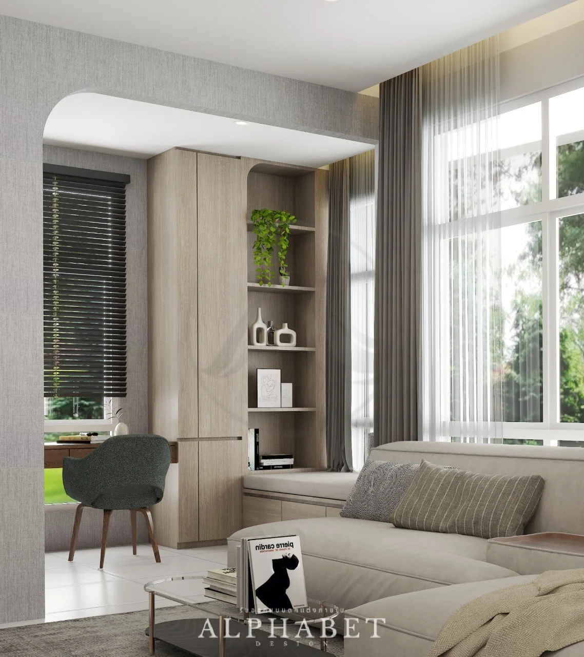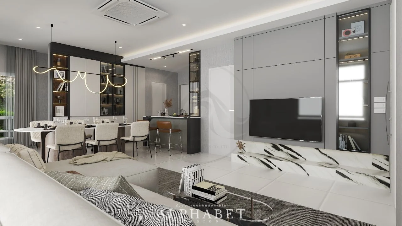 ผลงานดีไซน์สไตล์โมเดิร์น บ้านหลังนี้เราตั้งใจทำบ้านให้เป็นศูนย์รวมของครอบครัว เมื่อสมาชิกทุกคนมาอยู่พร้อมกันจะสัมผัสได้ถึงการพักผ่อนที่แท้จริง โทนสีที่เลือกใช้เป็นโทนสีที่ให้ความรู้สึกอบอุ่น สบายๆ และผ่อนคลาย