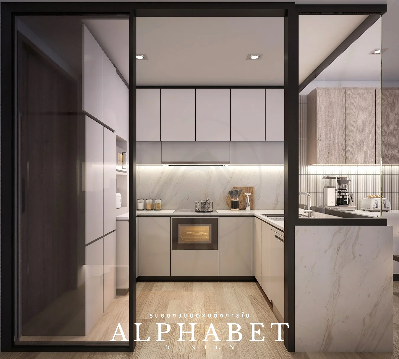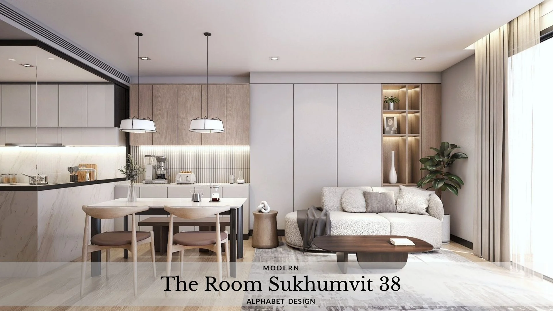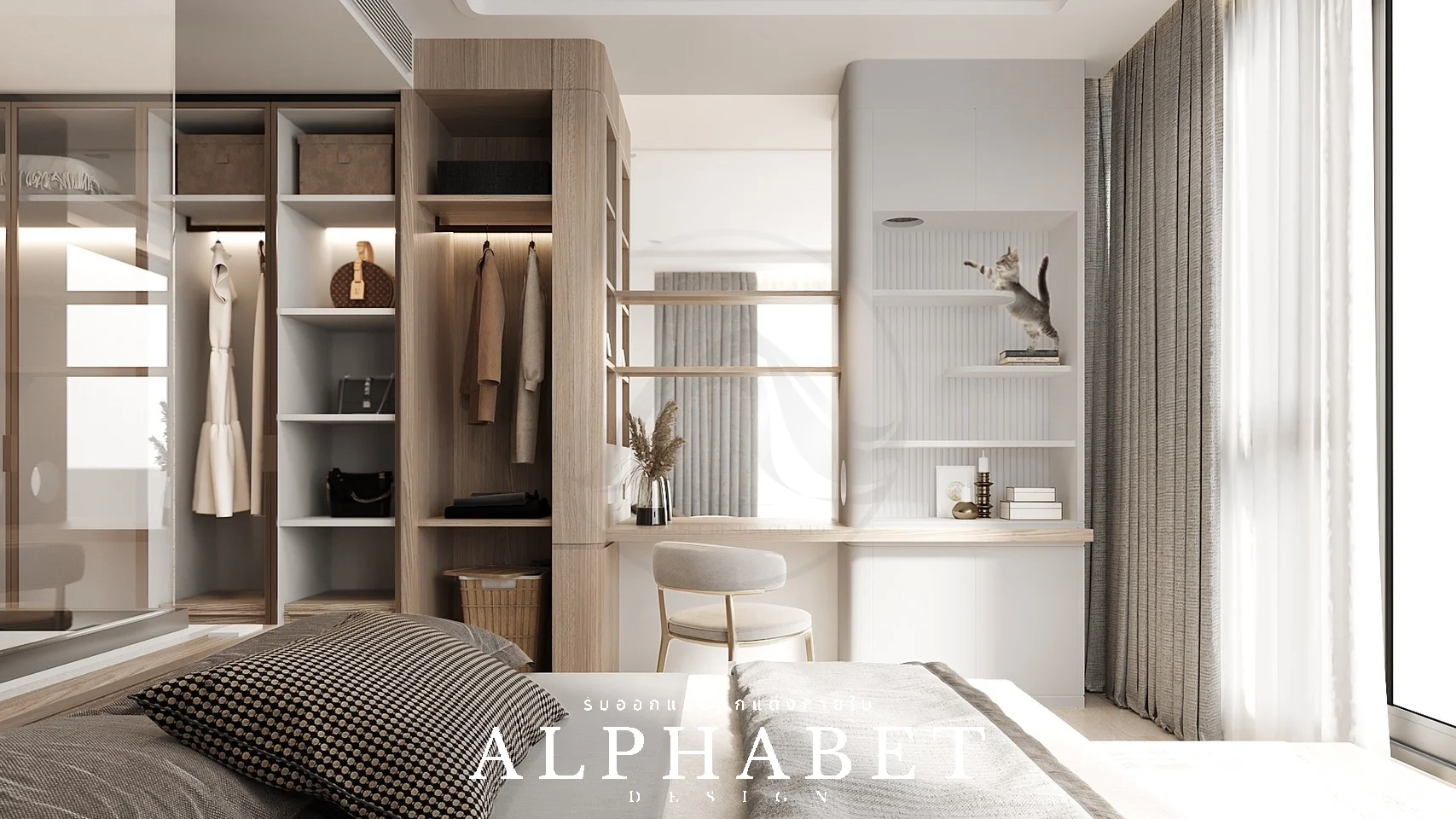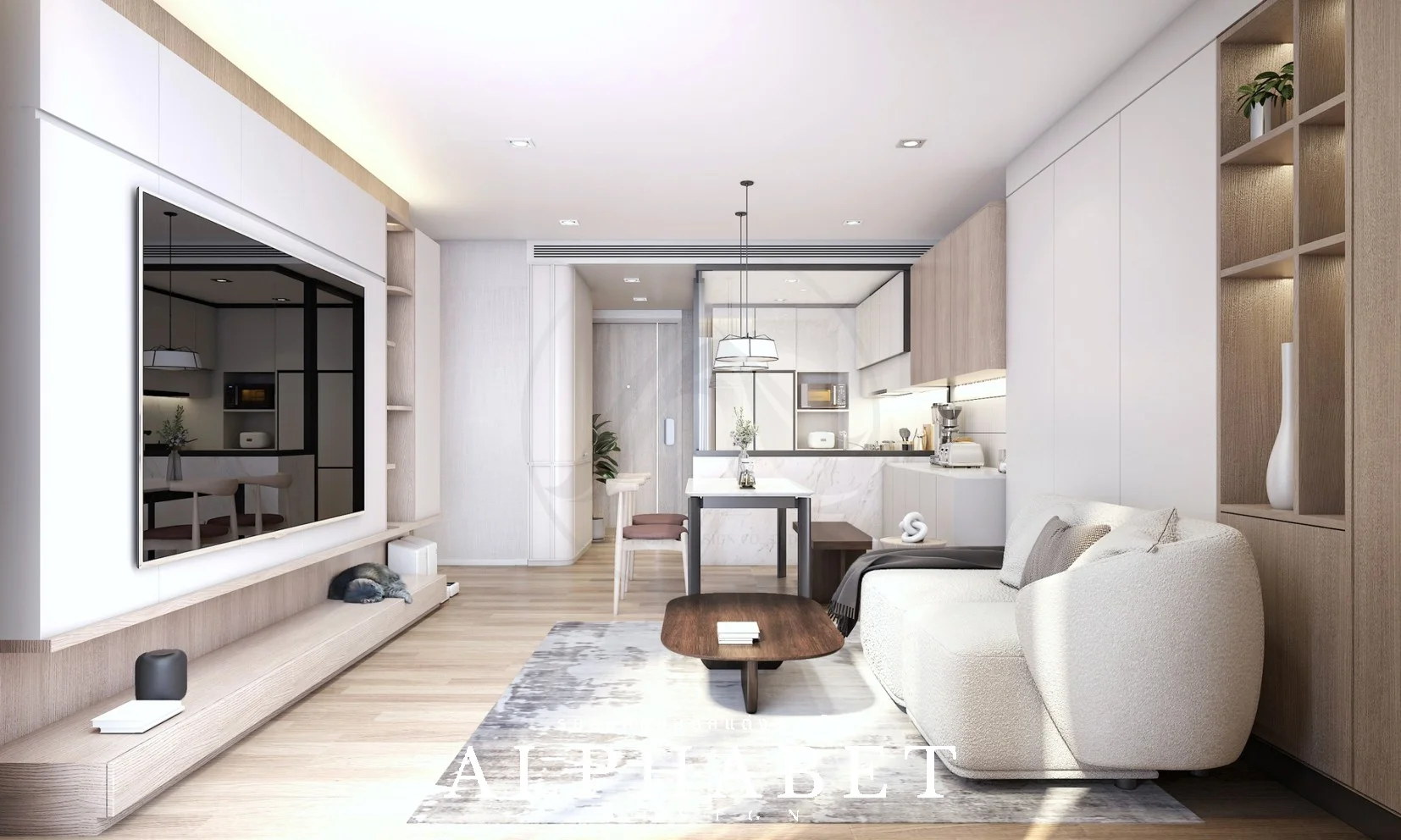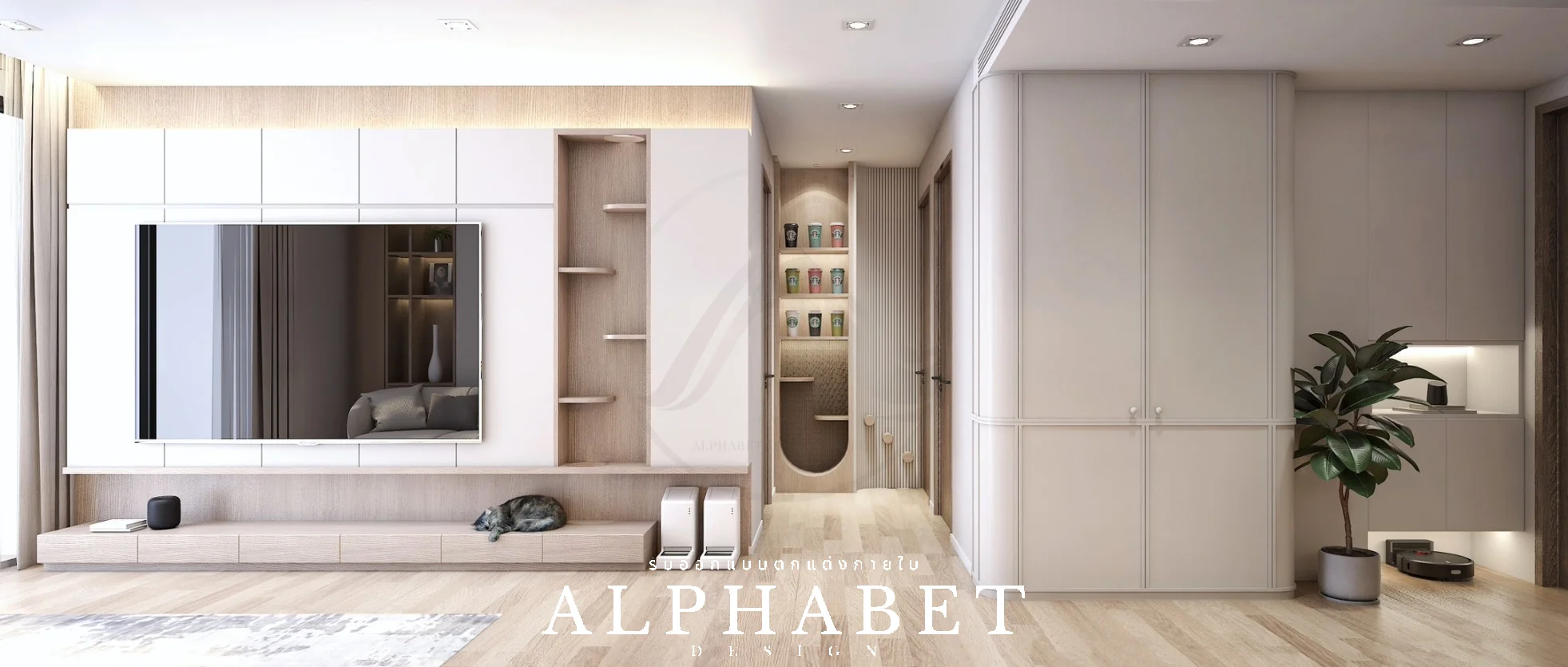 เป็นคอนโดที่ตกแต่งในรูปแบบสไตล์ Modern ทำให้ความรู้สึกภายในห้องนี้มีความเรียบง่าย อบอุ่น สบายตา โดยเน้นสีขาว เทา และลายไม้ แถมยังมีมุมสำหรับชงกาแฟ และพื้นที่สำหรับน้องแมว
